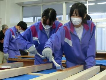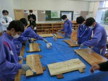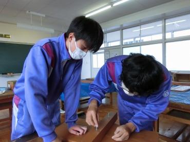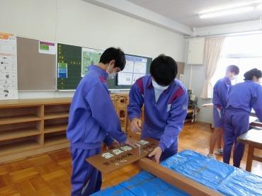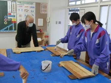 9年生が行っている法住寺から曽の坊の滝の道づくりで使う、看板の制作がスタートしました。デザインは9年生が考え、柏原の宮口虎治さんにご協力をいただき看板を制作しています。今回は下地を塗る作業を行いました。宮口さんと初めて対面し、ご指導をいただきながら楽しく作業を進めることができました!