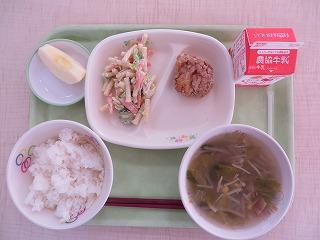 白ごはん から揚げ マカロニサラダ レタススープ りんご 牛乳