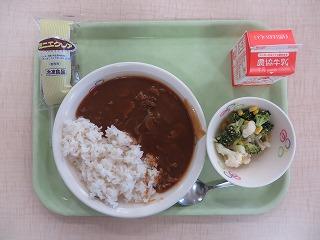 ハヤシライス 花野菜サラダ ミニエクレア 牛乳