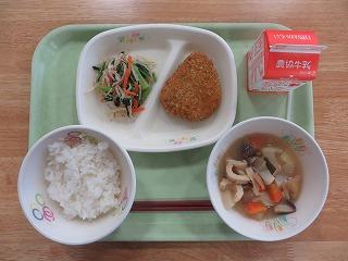 白ごはん かぼちゃひき肉フライ もやしのナムル 含め煮 牛乳