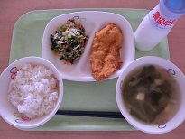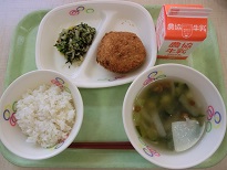 『麦ごはん・牛乳・手作りコロッケ・ひじきのいそ香り和え・揚げとなめこのみそしる』でした。