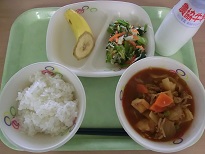 今年初めての給食は、カレー味の肉じゃがに挑戦しました。