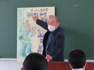 曽の坊の滝の名前の由来や,田崎さんたちがなぜ,曽の坊の滝への道づくりを行ったのか,そしてどんな苦労があったのかなどについて,お話をしていただきました。子どもたちはメモを取ったり,質問したりしながら興味津々でお話を聞いていました。