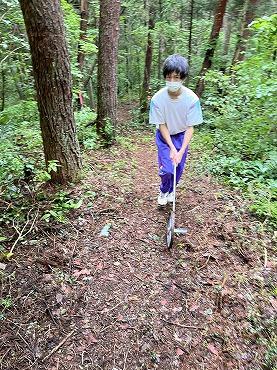 今回は除草作業に加えて道の距離の計測を行ってみました。全長に加えて、看板を立てる予定の区間を1つずつ計測しました。除草作業は全行程の6割に達し、開通に向けて見通しを持つことができるところまで来ました。