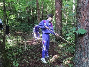今回は9年生の保護者の方にもご協力いただき、川を越えて道の整備を行いました。また、プライム128Jrの地原弘貴さんにはチェンソーで倒木を切っていただき、作業しやすい環境を作っていただきました。
