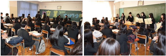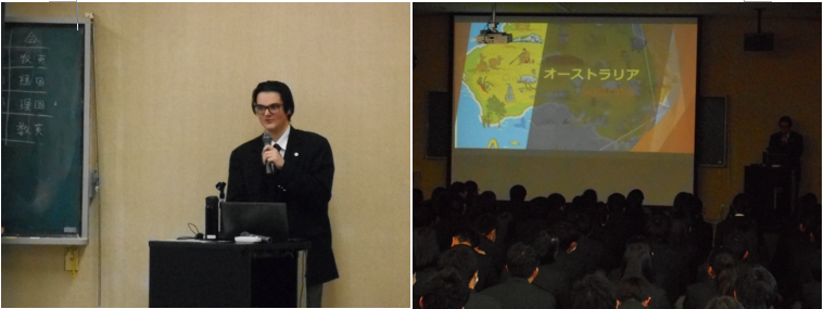 1月29日、留学生のジョシュアさんが帰国を前に、同級生である2年生の前で日本語でのスピーチを披露しました。オーストラリアの様々な文化をクイズ形式のパワーポイントで流暢な日本語で話し、正解者にはオーストラリアのお菓子をくれるなどのお楽しみも用意してあり、生徒たちはジョシュアさんとの最後のひとときを楽しみました。最後にみんなを代表してジョシュアさんが在籍していた26Hのホーム委員長から感謝の花束が贈られました。