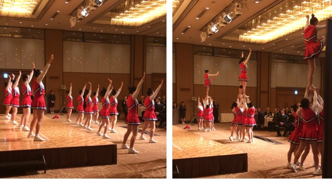 12月8日(土)、ANAクラウンプラザホテルで行われました石川県高等学校体育連盟創立70周年記念祝賀会のオープニングにおきまして、チアリーディング部が演技をさせていただきました。