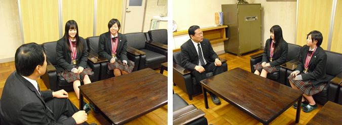 このほど、第11回全日本ユース水球選手権(岡山県)で石川選抜女子のメンバーとして出場し、見事、優勝を果たした本校の藤浜李帆さん(1年)と木村巴さん(1年)が、校長先生に優勝を報告しました。