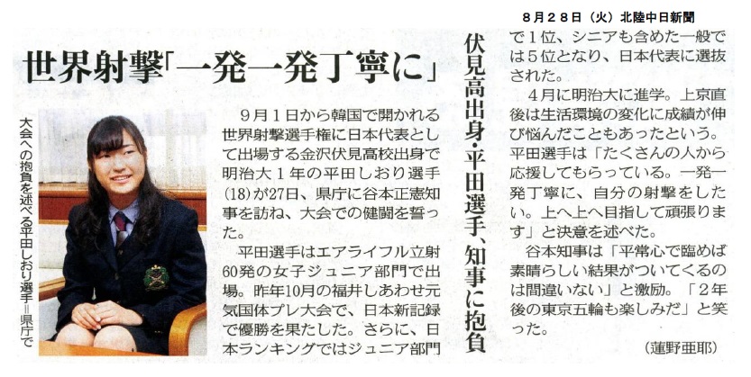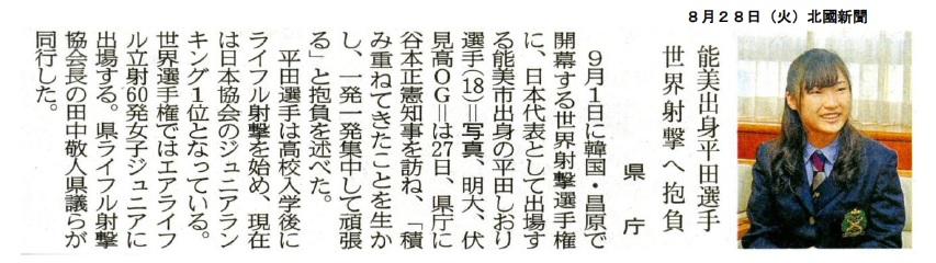 本校卒業生の平田しおりさん(明治大学1年)が9月1日から韓国で開催される世界射撃選手権に日本代表として出場することになり、このほど県庁へ谷本正憲知事を訪ね、大会での健闘を誓いました。平田さんの素晴らしいご活躍を全校あげて応援しております。