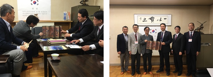 金院長から贈呈された屏風 左から3人目が金院長