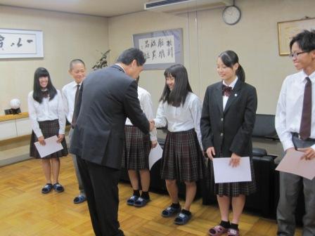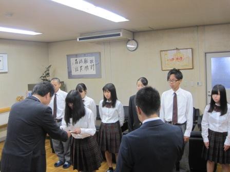 任命証をもらう後期生徒会役員 一人ひとり 校長先生と握手