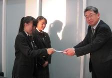 本校の生徒会代表が、中日新聞北陸本社に清流祭の模擬店利益48,086円を