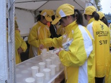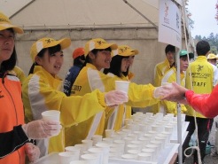 給水の準備 選手に給水コップを手渡す本校の生徒