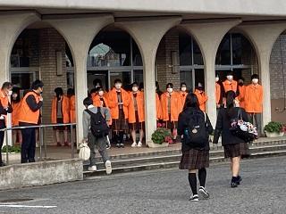 各クラスに呼びかけ、1日に2クラスが担当となり生徒玄関前であいさつをしています。
