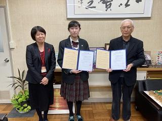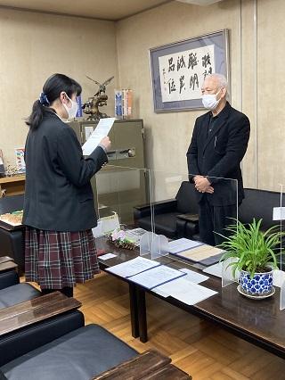 米泉校下町会連合会会長の山田八郎様と本校生徒会長の吉田遥香さんが