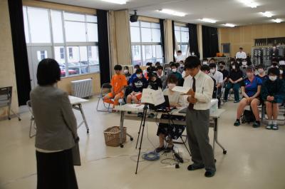 各部の代表者が視聴覚室に集まり、オンラインで各教室へ中継されました。