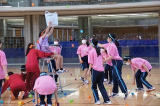 今年は、各学年を2クラスずつ組にして「桃団」「橙団」「水団」の3団に分け、「玉入れ」「台風の目」「綱引き」「学年別クラス対抗リレー」の4種目で得点を競い合いました。団に分けることにより学年を超えた交流が生まれ、3学年の縦のつながりが深まりました。