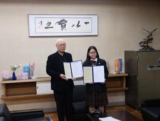生徒会長の森田真代さん(2年)が協定書を読み上げ、米泉校下町会連合会の山田八郎会長と協定書に捺印しました。生徒会長の森田さんは「コロナ過でボランティアに参加した経験が少ないので、住民の皆さんと触れ合いながら生徒全員で雪かきを頑張りたい」と思いを伝えました。