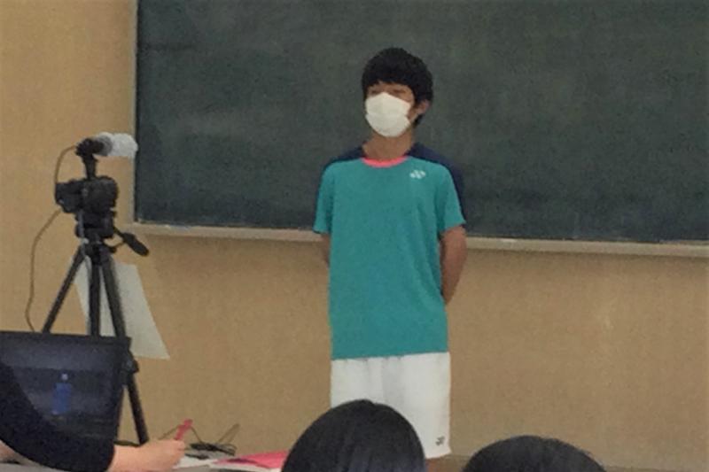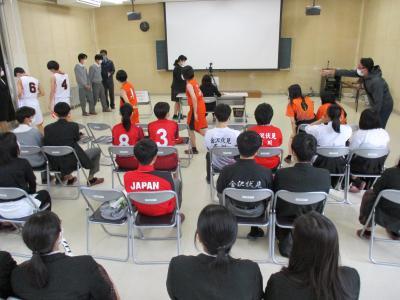 新人大会壮行式を視聴覚室で行い、各クラスにzoomで配信しました。