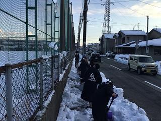 連合会から、通学路の歩道の除雪を依頼され、この日は男女テニス部、女子サッカー部の有志16名が参加しました。