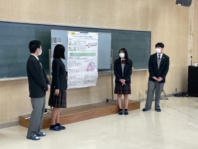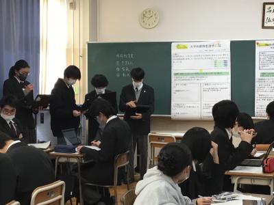 前週に行われたテーマ毎の代表グループの生徒たちが視聴覚室に集まり、最終発表会を実施しました。代表グループ以外は、各教室で発表動画の配信で参加しました。社会の課題と『学問』がどのようなつながりがあるのか、どのようにして課題を解決していくのか、高校1年生の目線で案をすることができました。