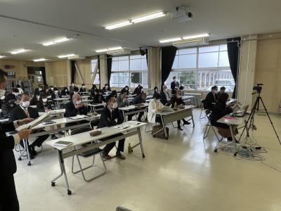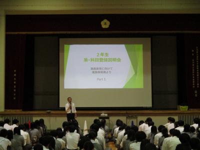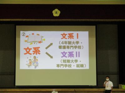生徒たちは進路指導課と教務課からのわかりやすく工夫された説明を真剣に聞いていました。将来を見据えた今後の選択にぜひ生かしてほしいです。