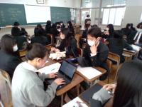 今日は、自らの興味のある分野や希望の進路に近い企業の方のインタビューDVD視聴を行い、企業の課題について学びました。その後1~3学年混合の分野別グループで、「関連のある学問」「職業と進路先」「進路先で何を学ぶか」ということを話し合い、お互いに発表しました。