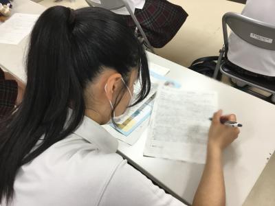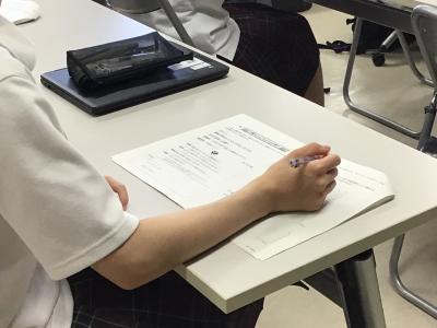 生徒たちは小論文を書くためのコツを資料にたくさん書きこみながら講義を真剣に聞いていました。