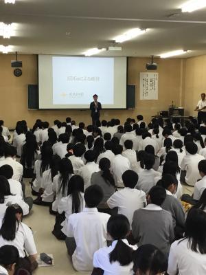 9月7日(木)6限目1年生 総合的な探究の時間では、地域の特色を活かしたふるさと教育推進事業の一環として、会宝産業株式会社 代表取締役社長 近藤高行氏をお招きして、「SDGsによる経営」との演題で講演をしていただきました。