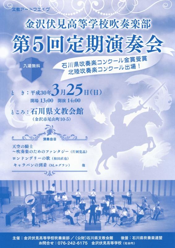 今年も3月25日(日)14時より、石川県文教会館において第5回定期演奏会を開催いたします。創意工夫を凝らした楽しいステージを準備しております。部員一同みなさまにお会いできることを楽しみに一生懸命練習しています。入場無料ですので、みなさま是非お誘い合わせの上ご来場ください。 (お問い合わせは本校まで)