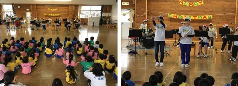12月28日(木)本校吹奏楽部が伏見かわい幼稚園で「妖怪ウォッチメドレー」「アンパンマンたいそう」「夢をかなえてドラえもん」など、園児の皆さんになじみ深い曲を演奏しました。園児の皆さんは、曲に合わせて歌ったり踊ったりと、とても元気に楽しんでくださり会場は大いに盛り上がりました。