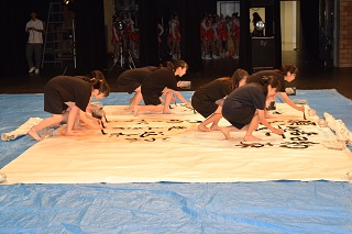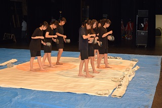 新入生を迎えるに際し、書道パフォーマンスの練習中。