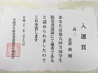 本校書道部員、北倉 萌(応募当時2年生、現3年生)が入選賞を受賞。