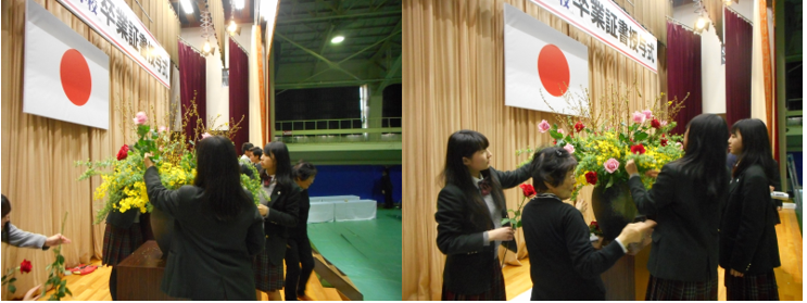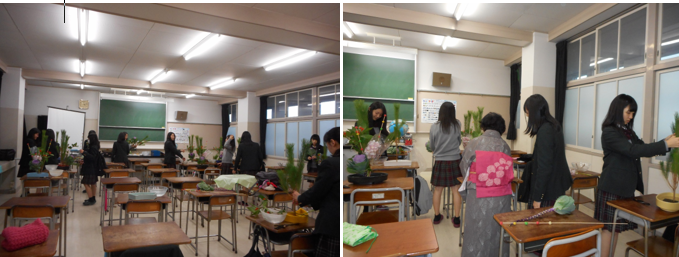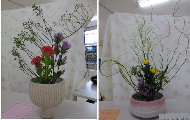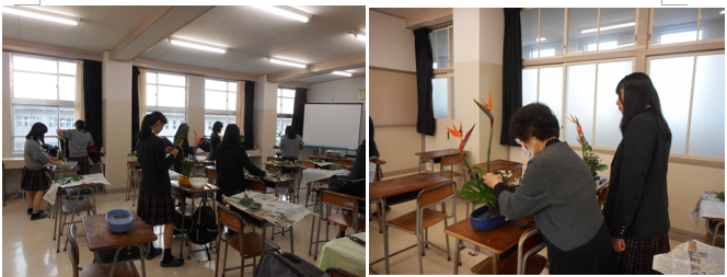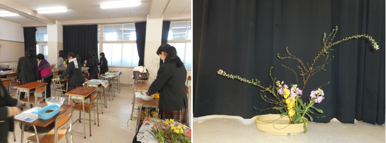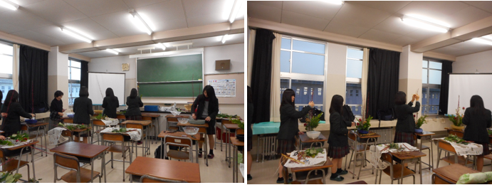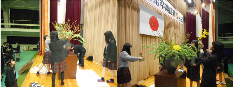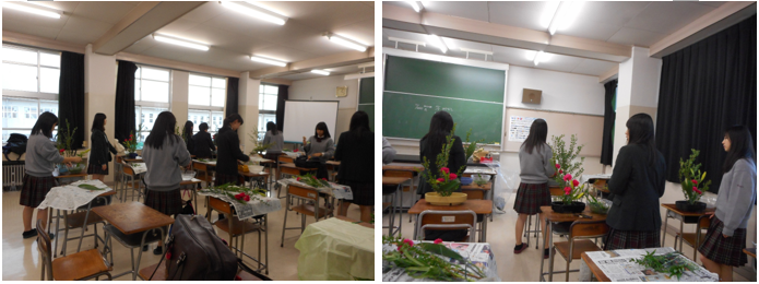 伏見高校に合格されたみなさん、おめでとうございます。華道部に入って一緒にお花を生けませんか?部員は新3年生6人、新2年生16人の計22人です。毎週水曜日の放課後に集まって活動しています。お花の流派は「草月流」で、お花の先生が学校にいらして指導してくださっています。文化祭で展示をしたり、12月にはクリスマスの花やお正月のお花の生け方をご指導していただいています。卒業時にはお免状を取ることもできます。季節のお花を身近に感じることのできるとても楽しい部活です。