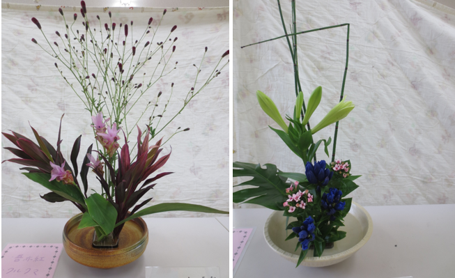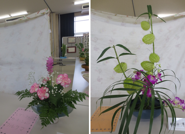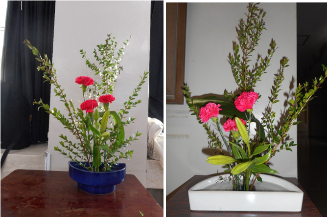 今月3度目の部活動です。今日のお花は金香木、カーネーション、ユリ、葉蘭です。ユリは今は蕾ですが、咲いた時のことをイメージして、開いてボリュームが出る分、短めに生けます。金香木はいらない葉を取るとすっきりします。葉蘭を生けるときには、そのままではなく、ねじったり、曲げたりのひと工夫をするのがポイントです。
