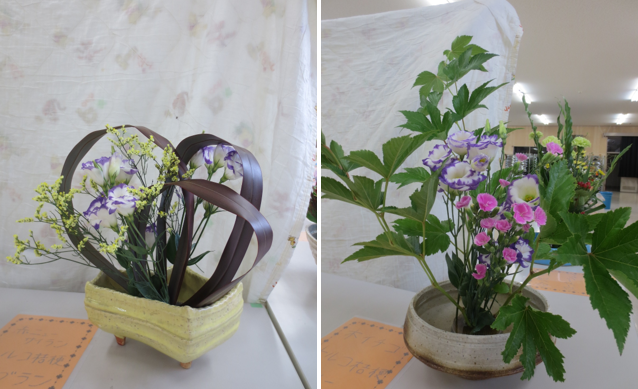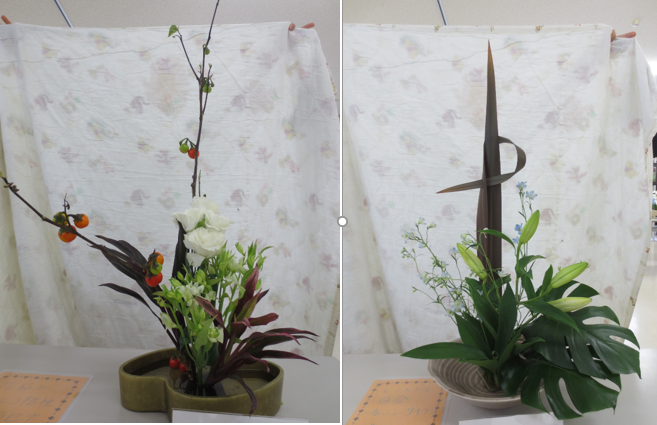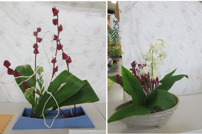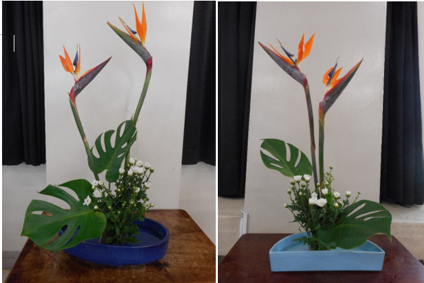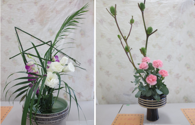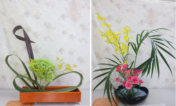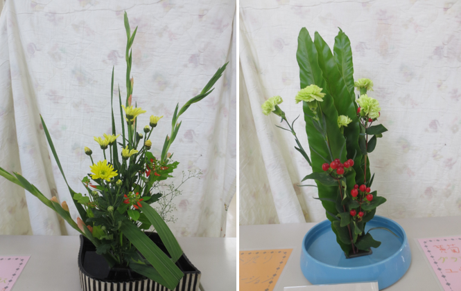今日のお花はオレンジ色で鶏のとさかのようなストレチア、白い小菊、大きな葉っぱのモンステラです。白の小菊を足元に低く生けると全体が引き締まります。ストレチアは頭が折れてしまいやすいので、要注意です。日ごろあまり目にしない珍しい花にみんな最初はちょっと戸惑っていましたが、上手に生けることができました。