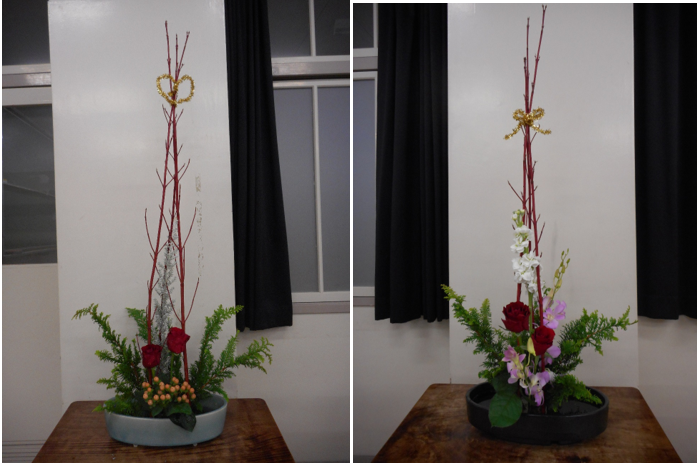 今日はクリスマス用のお花を生けました。サンゴミズキを三本まとめて金色のモールで結んでクリスマスツリーをイメージしてあります。その他の花材は、木の実のようなピペルカム、薔薇、黄金ヒバの組み合わせ、またはピペルカムの代わりに白のストックとピンクのデンファーレの組み合わせのものもあります。ピペルカムの葉はすぐに枯れてしまうので、初めから取っておきます。今日はいつもとちょっと勝手が違っていたので、みんな苦労していましたが、サンゴミズキを束ねる金のモールをリボン、ハート、星、雪だるまなどの形にアレンジして、楽しんで生けていました。