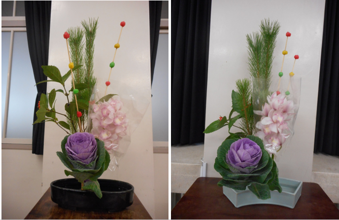 今日はお正月のお花を生けました。花材は枝若松、薄桃色のシンピジューム、千両、葉牡丹、お餅の加工品2本です。枝若松から松脂がでていて、手に付いてびっくりでしたが、みんな上手に生けられました。気持ちはすっかり新年です。