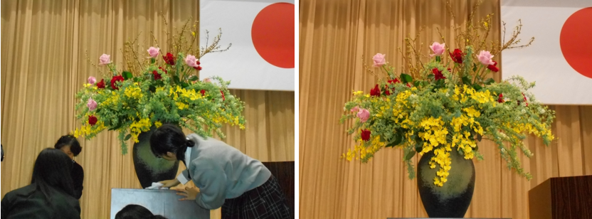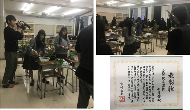 当日は「となりのテレ金ちゃん」準レギュラーでアイドルの宮崎由加さんと一緒に花を生けました。最後は下の画像にある表彰状を頂き、みんなで記念に集合写真を撮り楽しい時間を過ごしました。宮崎さんやディレクターの方からは、生徒たちが想像以上に話が上手で楽しい部活だったと褒めていただきました。