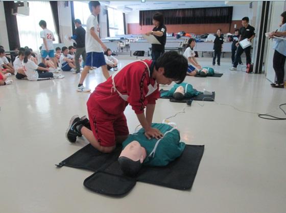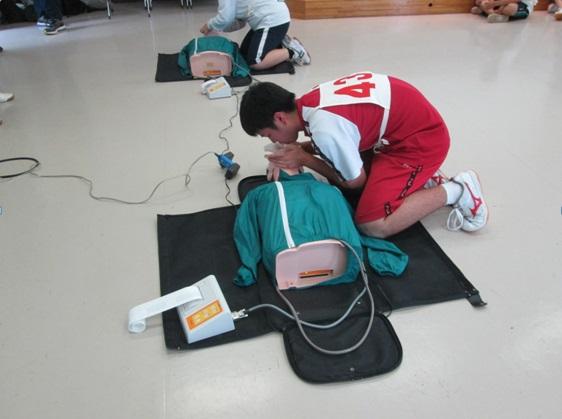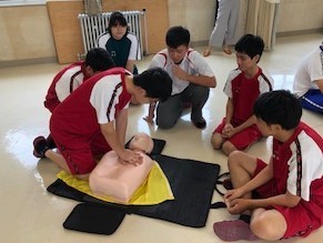 前半は献血について学び、後半は心肺蘇生や三角巾を用いた応急手当の仕方を