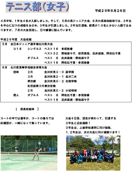 2017年4月13日 13時10分テニス部女子は、2年生8名、3年生8名、計16名の部員で、学校のテニスコート、西部緑地公園テニスコートなどで活動しています。部員たちは北信越出場や県大会入賞を目指して、日々練習に励んでいます。