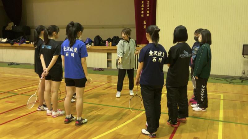 私達バドミントン部は、2年生15人(男子7、女子8)、1年生28人(男子10、女子18)の43人で日々練習しています。石川県高校総体を終え、引退して抜けた3年生の大きな穴を埋めるべく、部員みんなで協力し、次の目標に向かって出発したところです。毎日の練習では、ランニングや基本練習、フットワークやノック練習などで体力や基本技術をしっかり固め、ゲーム練習で実践的な実力を磨いています。どんな強い相手でも気持ちで負けないように一生懸命に練習に励んでいます。練習日は水曜日を除く毎日で、第一体育館で活動しています。OBやOG、武者修行に訪れる他校の生徒などもよく練習にやってきます。見学や飛び入り練習などいつでも歓迎です。