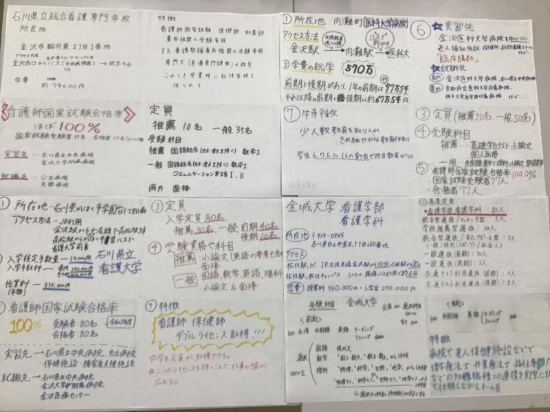 今回は看護師国家試験資格が得られる県内の上級学校について、グループに分かれて調べて発表し、