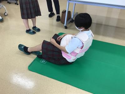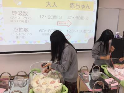 妊婦体験、おむつ交換、聴診器を使って赤ちゃん人形の心拍数や呼吸数の測定を行いました。
