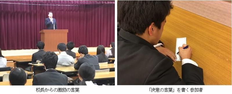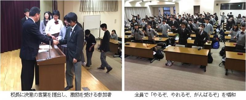 本日より3日間の日程で、2年生の勉強合宿が石川県青少年総合研修センター(金沢市常盤町)で始まりました。初日の今日は、この合宿参加への思いを記した「決意の言葉」を書き、直接校長へ提出し、激励を受けました。その後、校長のリードのもと、参加者全員で「やるぞ! やれるぞ! がんばるぞ!」を声高らかに唱和し、合宿参加への意気込みを新たにしました。