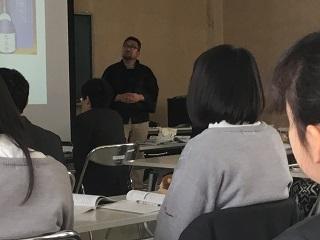 金沢大学人間社会学域地域創造学類環境共生コース准教授の青木賢人氏による2年生地理Aの出張授業が始まりました。この授業は、石川県教育委員会が実施する「外部専門家を活用した最先端分野を学ぶ授業推進事業」の一環として、2月15日(木)と19日(月)の2日間にわたって行われます。1日目の授業では、自然環境が日本や石川県の人々の生活や産業にどのような影響を与えているのか、石川県の酒造りなどを例にわかりやすくお話しくださいました
