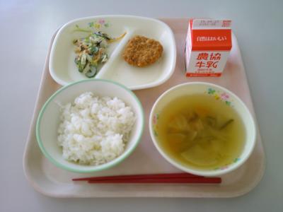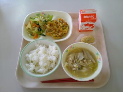 今日の給食は、きのこの炒め煮、大根の和風サラダ、なめこのみそ汁でした。