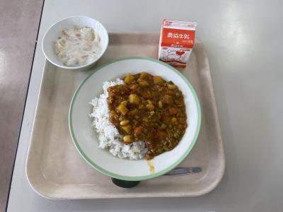 今日の給食は、キーマカレー、フルーツヨーグルトでした。