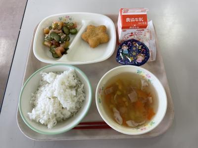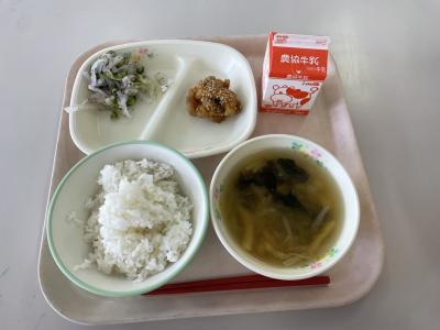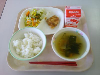 今日の給食は、若鶏のごまがらめでした。