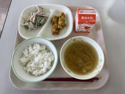今日の給食は、チキンカツ、ひじきの煮物、オクラのみそ汁でした。